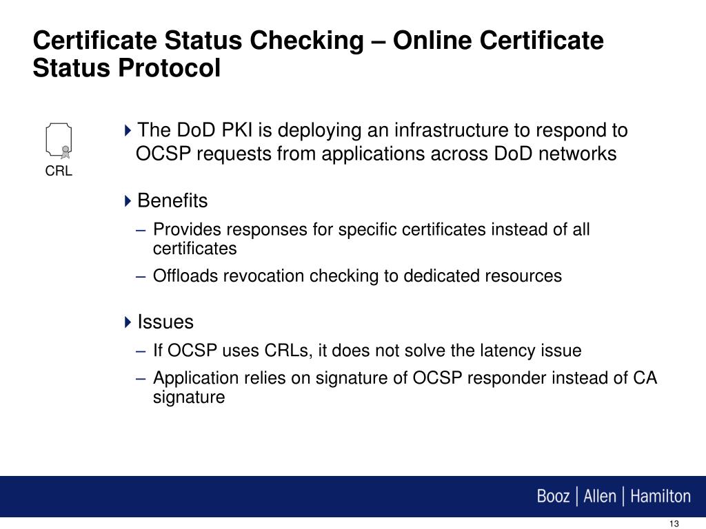 Certificate Status Checking – Online Certificate Status Protocol • The DoD PKI is deploying an infrastructure to respond to OCSP requests from applications across DoD networks • Benefits • Provides responses for specific certificates instead of all certificates • Offloads revocation checking to dedicated resources • Issues • If OCSP uses CRLs, it does not solve the latency issue • Application relies on signature of OCSP responder instead of CA signature CRL