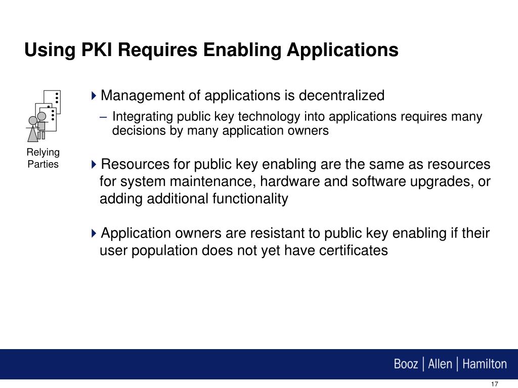 Using PKI Requires Enabling Applications • Management of applications is decentralized • Integrating public key technology into applications requires many decisions by many application owners • Resources for public key enabling are the same as resources for system maintenance, hardware and software upgrades, or adding additional functionality • Application owners are resistant to public key enabling if their user population does not yet have certificates Relying Parties