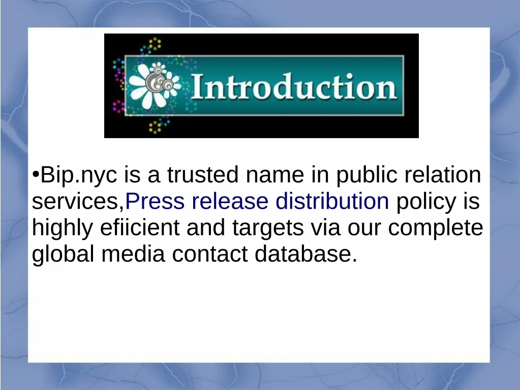●Bip.nyc is a trusted name in public relation services,Press release distribution policy is highly efiicient and targets via our complete global media contact database.
