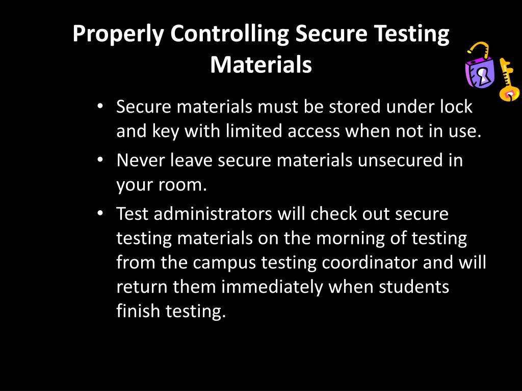 Properly Controlling Secure Testing Materials • Secure materials must be stored under lock and key with limited access when not in use. • Never leave secure materials unsecured in your room. • Test administrators will check out secure testing materials on the morning of testing from the campus testing coordinator and will return them immediately when students finish testing.
