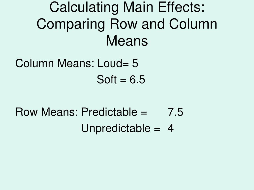 Calculating Main Effects: Comparing Row and Column Means Column Means: Loud= 5 Soft = 6.5 Row Means: Predictable = 7.5 Unpredictable = 4