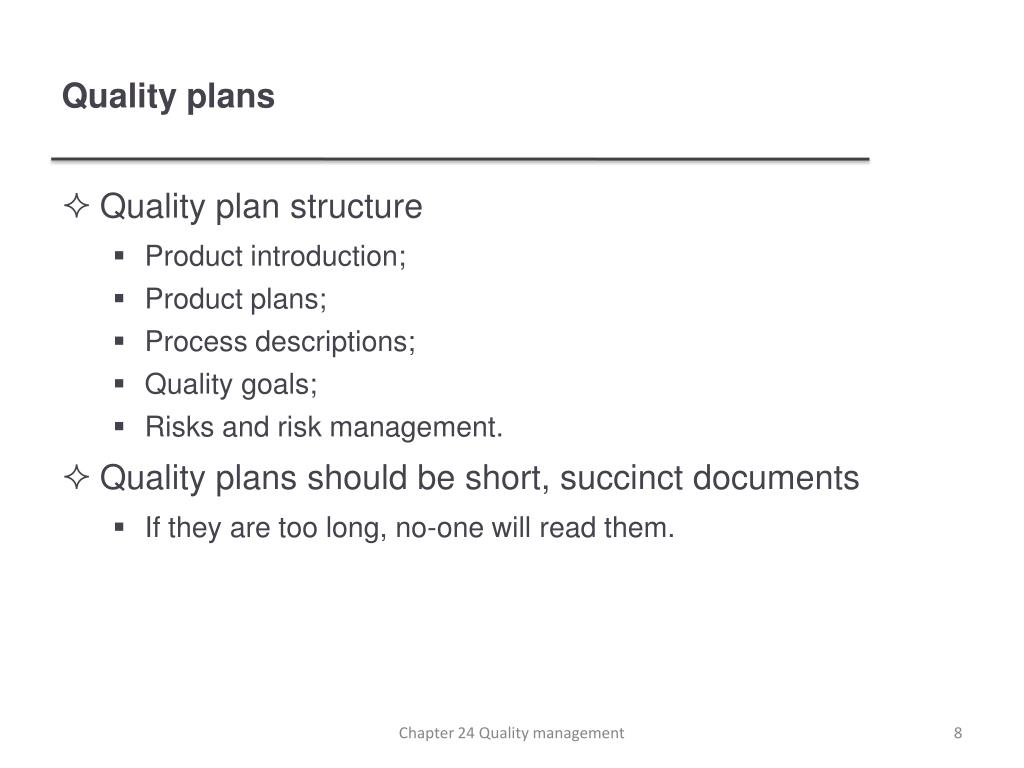 Quality planning • A quality plan sets out the desired product qualities and how these are assessed and defines the most significant quality attributes. • The quality plan should define the quality assessment process. • It should set out which organisational standards should be applied and, where necessary, define new standards to be used. Chapter 24 Quality management