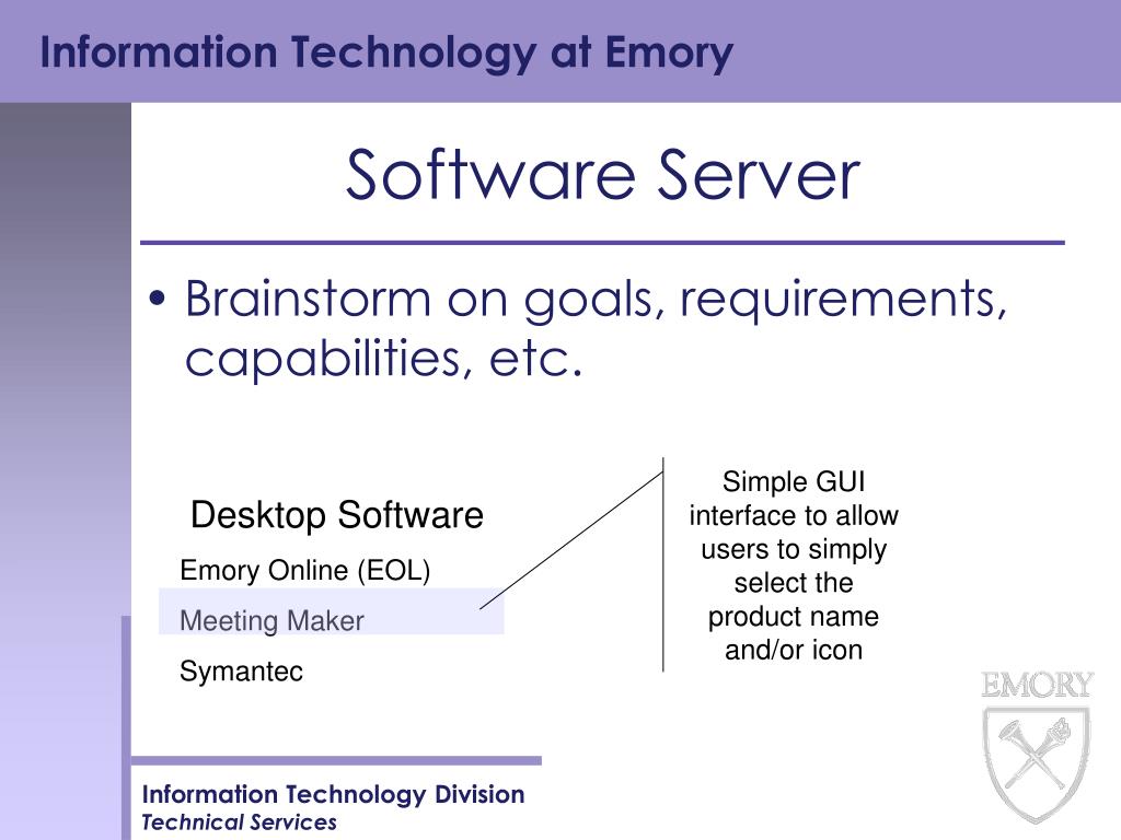 Software Server • Brainstorm on goals, requirements, capabilities, etc. Simple GUI interface to allow users to simply select the product name and/or icon Desktop Software Emory Online (EOL) Meeting Maker Symantec