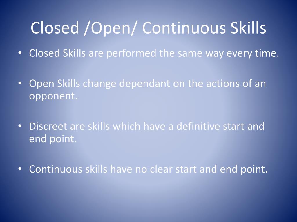 Closed /Open/ Continuous Skills • Closed Skills are performed the same way every time. • Open Skills change dependant on the actions of an opponent. • Discreet are skills which have a definitive start and end point. • Continuous skills have no clear start and end point.