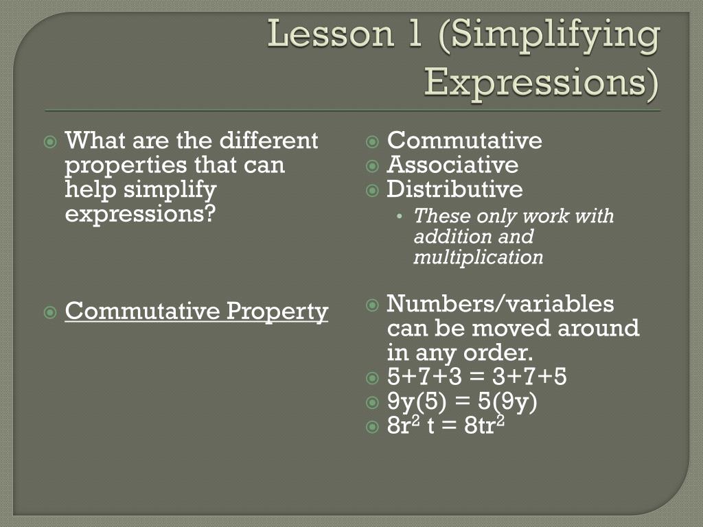 Lesson 1 (Simplifying Expressions) • What are the different properties that can help simplify expressions? • Commutative Property • Commutative • Associative • Distributive • These only work with addition and multiplication • Numbers/variables can be moved around in any order. • 5+7+3 = 3+7+5 • 9y(5) = 5(9y) • 8r2 t = 8tr2