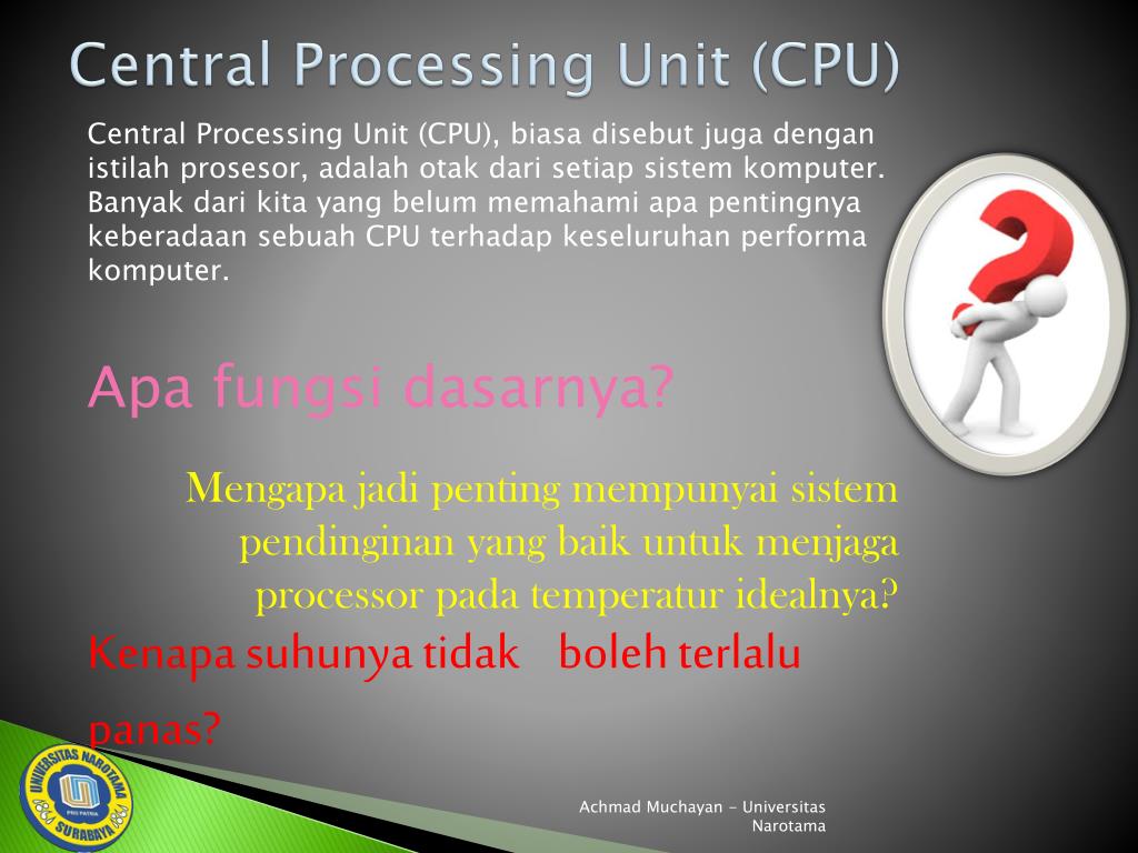 keberadaan CPU miripdenganotakpadamanusia. Didalamnyasetiapoperasi yang andalakukanpadakomputerdiprosesdi. Kinerjakomputerandaditentukanolehoperasi-operasimatematikasederhana. CPU adalahalat yang mengontrolsemuaoperasitersebut. Achmad Muchayan - Universitas Narotama