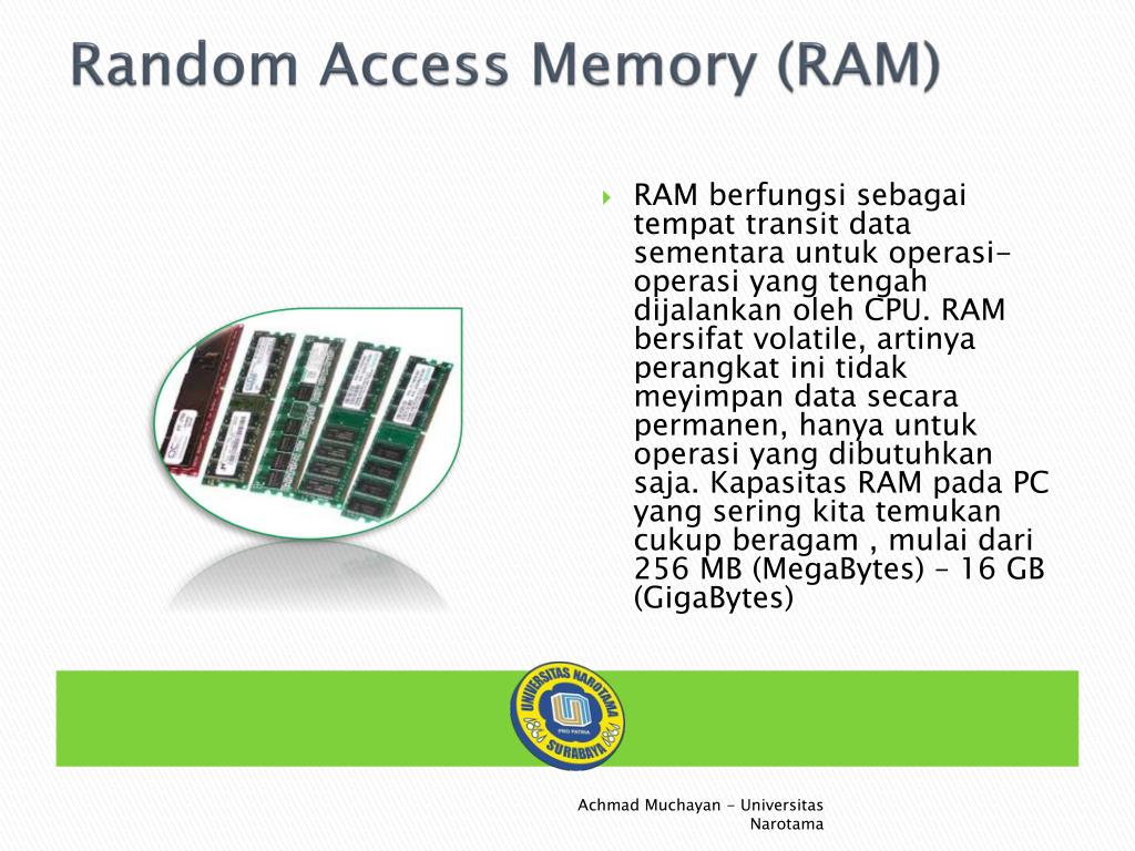 Random Access Memory (RAM) • RAM berfungsisebagaitempat transit data sementarauntukoperasi-operasi yang tengahdijalankanoleh CPU. RAM bersifat volatile, artinyaperangkatinitidakmeyimpan data secarapermanen, hanyauntukoperasi yang dibutuhkansaja. Kapasitas RAM pada PC yang seringkitatemukancukupberagam , mulaidari 256 MB (MegaBytes) – 16 GB (GigaBytes) Achmad Muchayan - Universitas Narotama