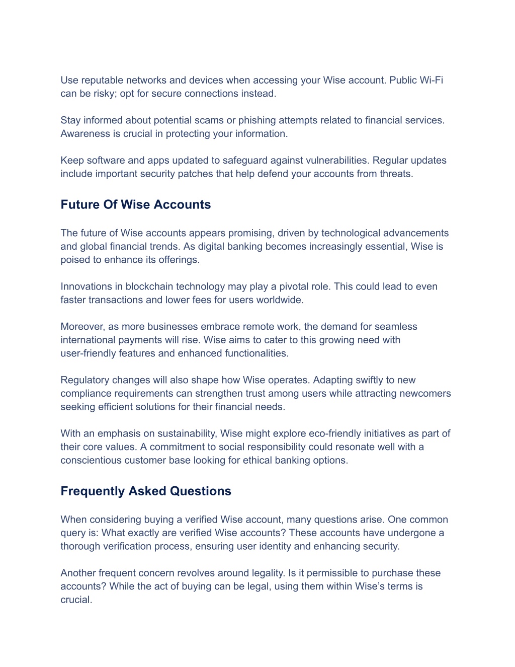 Use reputable networks and devices when accessing your Wise account. Public Wi-Fi can be risky; opt for secure connections instead. Stay informed about potential scams or phishing attempts related to financial services. Awareness is crucial in protecting your information. Keep software and apps updated to safeguard against vulnerabilities. Regular updates include important security patches that help defend your accounts from threats. Future Of Wise Accounts The future of Wise accounts appears promising, driven by technological advancements and global financial trends. As digital banking becomes increasingly essential, Wise is poised to enhance its offerings. Innovations in blockchain technology may play a pivotal role. This could lead to even faster transactions and lower fees for users worldwide. Moreover, as more businesses embrace remote work, the demand for seamless international payments will rise. Wise aims to cater to this growing need with user-friendly features and enhanced functionalities. Regulatory changes will also shape how Wise operates. Adapting swiftly to new compliance requirements can strengthen trust among users while attracting newcomers seeking efficient solutions for their financial needs. With an emphasis on sustainability, Wise might explore eco-friendly initiatives as part of their core values. A commitment to social responsibility could resonate well with a conscientious customer base looking for ethical banking options. Frequently Asked Questions When considering buying a verified Wise account, many questions arise. One common query is: What exactly are verified Wise accounts? These accounts have undergone a thorough verification process, ensuring user identity and enhancing security. Another frequent concern revolves around legality. Is it permissible to purchase these accounts? While the act of buying can be legal, using them within Wise’s terms is crucial.