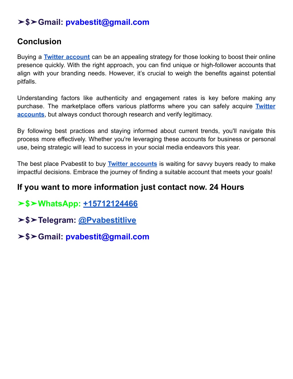 5. ➤$➤Gmail: pvabestit@gmail.com Conclusion Buying a Twitter account can be an appealing strategy for those looking to boost their online presence quickly. With the right approach, you can find unique or high-follower accounts that align with your branding needs. However, it’s crucial to weigh the benefits against potential pitfalls. Understanding factors like authenticity and engagement rates is key before making any purchase. The marketplace offers various platforms where you can safely acquire Twitter accounts, but always conduct thorough research and verify legitimacy. By following best practices and staying informed about current trends, you'll navigate this process more effectively. Whether you're leveraging these accounts for business or personal use, being strategic will lead to success in your social media endeavors this year. The best place Pvabestit to buy Twitter accounts is waiting for savvy buyers ready to make impactful decisions. Embrace the journey of finding a suitable account that meets your goals! If you want to more information just contact now. 24 Hours ➤$➤WhatsApp: +15712124466 ➤$➤Telegram: @Pvabestitlive ➤$➤Gmail: pvabestit@gmail.com