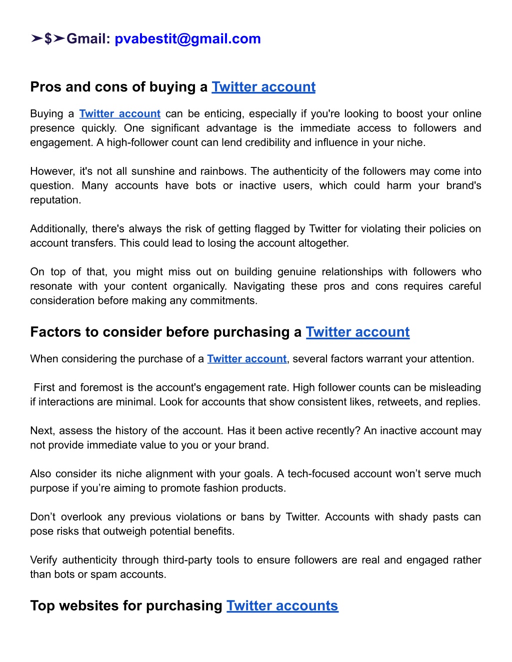 2. ➤$➤Gmail: pvabestit@gmail.com Pros and cons of buying a Twitter account Buying a Twitter account can be enticing, especially if you're looking to boost your online presence quickly. One significant advantage is the immediate access to followers and engagement. A high-follower count can lend credibility and influence in your niche. However, it's not all sunshine and rainbows. The authenticity of the followers may come into question. Many accounts have bots or inactive users, which could harm your brand's reputation. Additionally, there's always the risk of getting flagged by Twitter for violating their policies on account transfers. This could lead to losing the account altogether. On top of that, you might miss out on building genuine relationships with followers who resonate with your content organically. Navigating these pros and cons requires careful consideration before making any commitments. Factors to consider before purchasing a Twitter account When considering the purchase of a Twitter account, several factors warrant your attention. First and foremost is the account's engagement rate. High follower counts can be misleading if interactions are minimal. Look for accounts that show consistent likes, retweets, and replies. Next, assess the history of the account. Has it been active recently? An inactive account may not provide immediate value to you or your brand. Also consider its niche alignment with your goals. A tech-focused account won’t serve much purpose if you’re aiming to promote fashion products. Don’t overlook any previous violations or bans by Twitter. Accounts with shady pasts can pose risks that outweigh potential benefits. Verify authenticity through third-party tools to ensure followers are real and engaged rather than bots or spam accounts. Top websites for purchasing Twitter accounts