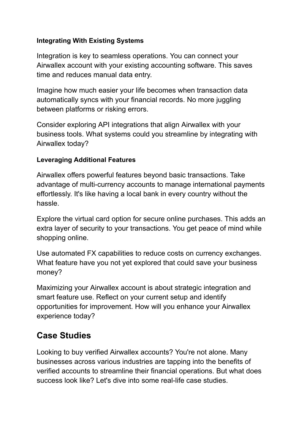Integrating With Existing Systems Integration is key to seamless operations. You can connect your Airwallex account with your existing accounting software. This saves time and reduces manual data entry. Imagine how much easier your life becomes when transaction data automatically syncs with your financial records. No more juggling between platforms or risking errors. Consider exploring API integrations that align Airwallex with your business tools. What systems could you streamline by integrating with Airwallex today? Leveraging Additional Features Airwallex offers powerful features beyond basic transactions. Take advantage of multi-currency accounts to manage international payments effortlessly. It's like having a local bank in every country without the hassle. Explore the virtual card option for secure online purchases. This adds an extra layer of security to your transactions. You get peace of mind while shopping online. Use automated FX capabilities to reduce costs on currency exchanges. What feature have you not yet explored that could save your business money? Maximizing your Airwallex account is about strategic integration and smart feature use. Reflect on your current setup and identify opportunities for improvement. How will you enhance your Airwallex experience today? Case Studies Looking to buy verified Airwallex accounts? You're not alone. Many businesses across various industries are tapping into the benefits of verified accounts to streamline their financial operations. But what does success look like? Let's dive into some real-life case studies.