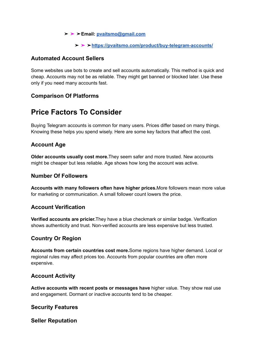 ➤➤➤Email: pvaitsmo@gmail.com ➤➤➤https://pvaitsmo.com/product/buy-telegram-accounts/ Automated Account Sellers Some websites use bots to create and sell accounts automatically. This method is quick and cheap. Accounts may not be as reliable. They might get banned or blocked later. Use these only if you need many accounts fast. Comparison Of Platforms Price Factors To Consider Buying Telegram accounts is common for many users. Prices differ based on many things. Knowing these helps you spend wisely. Here are some key factors that affect the cost. Account Age Older accounts usually cost more.They seem safer and more trusted. New accounts might be cheaper but less reliable. Age shows how long the account was active. Number Of Followers Accounts with many followers often have higher prices.More followers mean more value for marketing or communication. A small follower count lowers the price. Account Verification Verified accounts are pricier.They have a blue checkmark or similar badge. Verification shows authenticity and trust. Non-verified accounts are less expensive but less trusted. Country Or Region Accounts from certain countries cost more.Some regions have higher demand. Local or regional rules may affect prices too. Accounts from popular countries are often more expensive. Account Activity Active accounts with recent posts or messages have higher value. They show real use and engagement. Dormant or inactive accounts tend to be cheaper. Security Features Seller Reputation