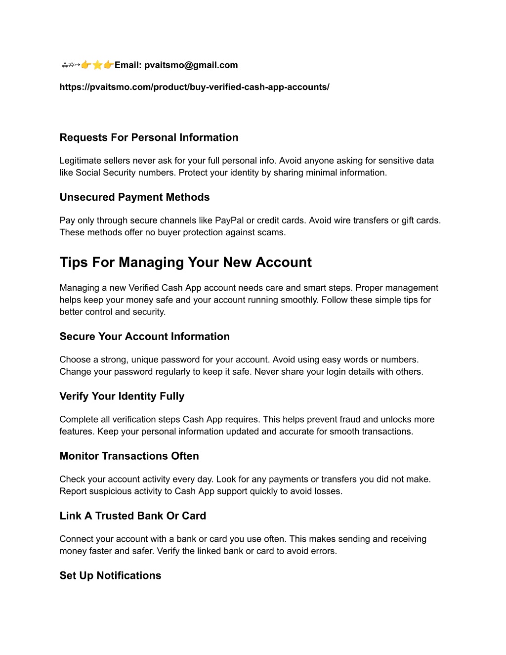7. ⁂⇏↣?⭐?Email: pvaitsmo@gmail.com https://pvaitsmo.com/product/buy-verified-cash-app-accounts/ Requests For Personal Information Legitimate sellers never ask for your full personal info. Avoid anyone asking for sensitive data like Social Security numbers. Protect your identity by sharing minimal information. Unsecured Payment Methods Pay only through secure channels like PayPal or credit cards. Avoid wire transfers or gift cards. These methods offer no buyer protection against scams. Tips For Managing Your New Account Managing a new Verified Cash App account needs care and smart steps. Proper management helps keep your money safe and your account running smoothly. Follow these simple tips for better control and security. Secure Your Account Information Choose a strong, unique password for your account. Avoid using easy words or numbers. Change your password regularly to keep it safe. Never share your login details with others. Verify Your Identity Fully Complete all verification steps Cash App requires. This helps prevent fraud and unlocks more features. Keep your personal information updated and accurate for smooth transactions. Monitor Transactions Often Check your account activity every day. Look for any payments or transfers you did not make. Report suspicious activity to Cash App support quickly to avoid losses. Link A Trusted Bank Or Card Connect your account with a bank or card you use often. This makes sending and receiving money faster and safer. Verify the linked bank or card to avoid errors. Set Up Notifications