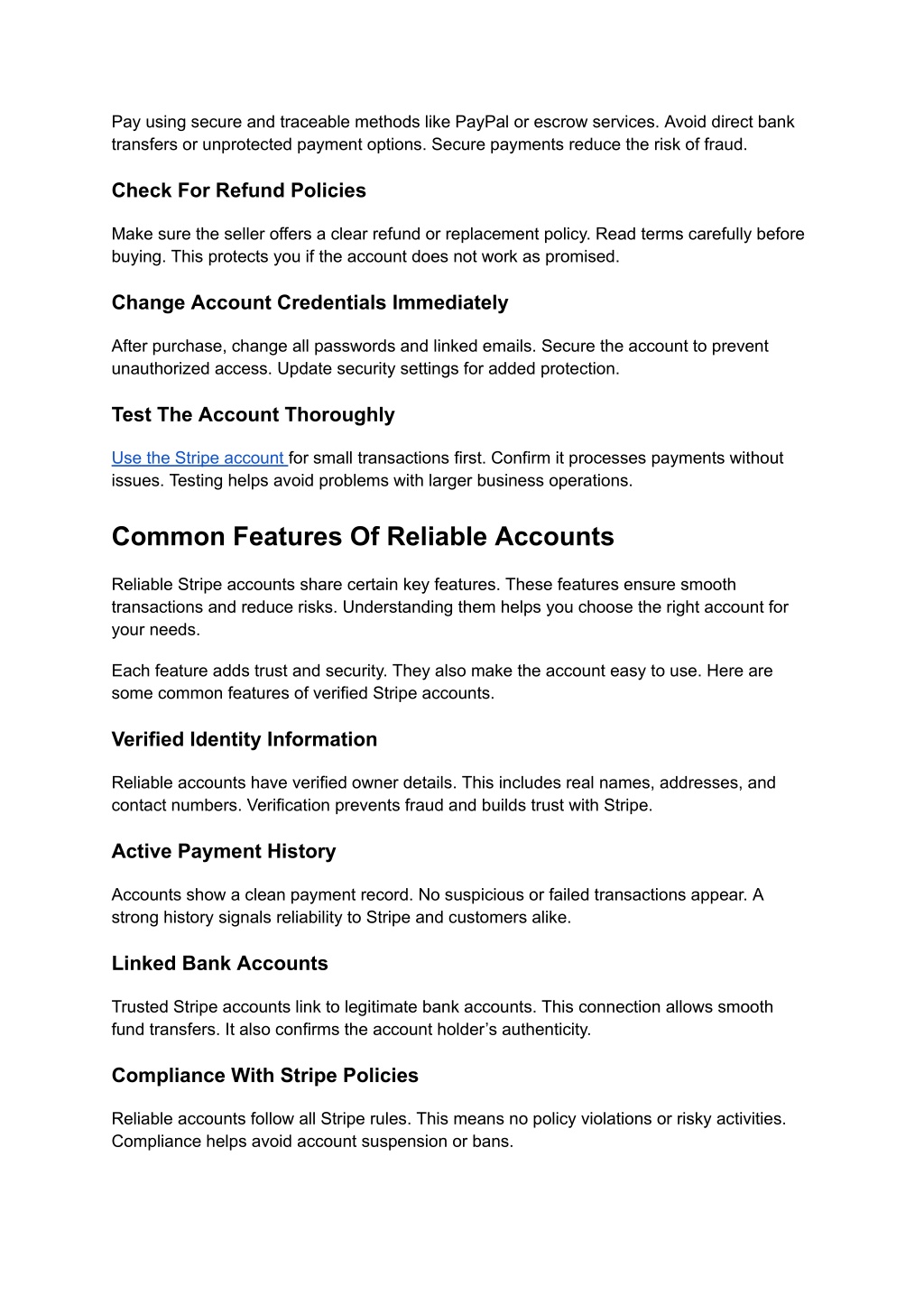 6. Pay using secure and traceable methods like PayPal or escrow services. Avoid direct bank transfers or unprotected payment options. Secure payments reduce the risk of fraud. Check For Refund Policies Make sure the seller offers a clear refund or replacement policy. Read terms carefully before buying. This protects you if the account does not work as promised. Change Account Credentials Immediately After purchase, change all passwords and linked emails. Secure the account to prevent unauthorized access. Update security settings for added protection. Test The Account Thoroughly Use the Stripe account for small transactions first. Confirm it processes payments without issues. Testing helps avoid problems with larger business operations. Common Features Of Reliable Accounts Reliable Stripe accounts share certain key features. These features ensure smooth transactions and reduce risks. Understanding them helps you choose the right account for your needs. Each feature adds trust and security. They also make the account easy to use. Here are some common features of verified Stripe accounts. Verified Identity Information Reliable accounts have verified owner details. This includes real names, addresses, and contact numbers. Verification prevents fraud and builds trust with Stripe. Active Payment History Accounts show a clean payment record. No suspicious or failed transactions appear. A strong history signals reliability to Stripe and customers alike. Linked Bank Accounts Trusted Stripe accounts link to legitimate bank accounts. This connection allows smooth fund transfers. It also confirms the account holder’s authenticity. Compliance With Stripe Policies Reliable accounts follow all Stripe rules. This means no policy violations or risky activities. Compliance helps avoid account suspension or bans.