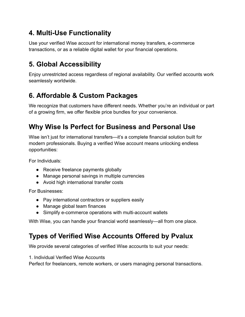 3. 4. Multi-Use Functionality Use your verified Wise account for international money transfers, e-commerce transactions, or as a reliable digital wallet for your financial operations. 5. Global Accessibility Enjoy unrestricted access regardless of regional availability. Our verified accounts work seamlessly worldwide. 6. Affordable & Custom Packages We recognize that customers have different needs. Whether you’re an individual or part of a growing firm, we offer flexible price bundles for your convenience. Why Wise Is Perfect for Business and Personal Use Wise isn’t just for international transfers—it’s a complete financial solution built for modern professionals. Buying a verified Wise account means unlocking endless opportunities: For Individuals: ● Receive freelance payments globally ● Manage personal savings in multiple currencies ● Avoid high international transfer costs For Businesses: ● Pay international contractors or suppliers easily ● Manage global team finances ● Simplify e-commerce operations with multi-account wallets With Wise, you can handle your financial world seamlessly—all from one place. Types of Verified Wise Accounts Offered by Pvalux We provide several categories of verified Wise accounts to suit your needs: 1. Individual Verified Wise Accounts Perfect for freelancers, remote workers, or users managing personal transactions.