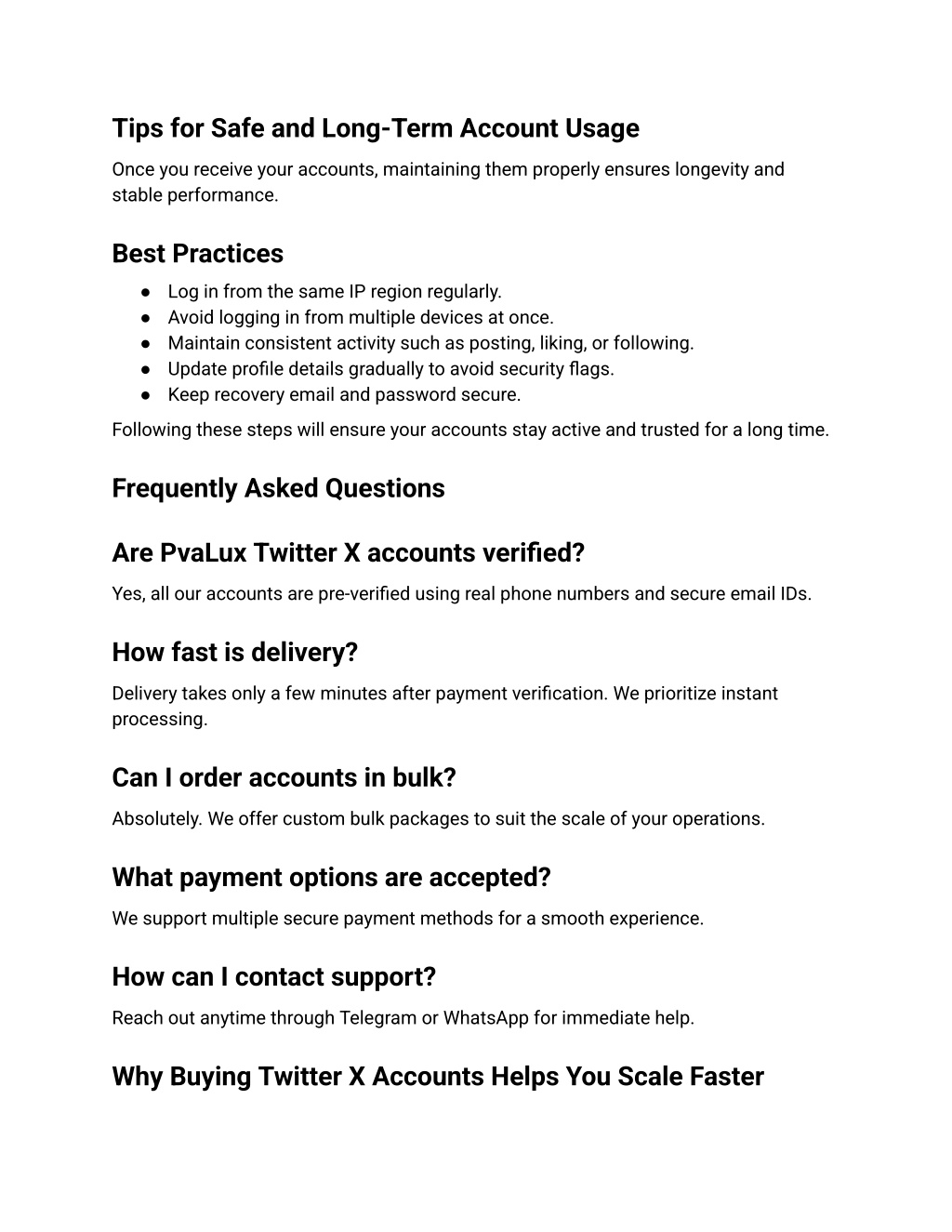 5. Tips for Safe and Long-Term Account Usage Once you receive your accounts, maintaining them properly ensures longevity and stable performance. Best Practices ● Log in from the same IP region regularly. ● Avoid logging in from multiple devices at once. ● Maintain consistent activity such as posting, liking, or following. ● Update profile details gradually to avoid security flags. ● Keep recovery email and password secure. Following these steps will ensure your accounts stay active and trusted for a long time. Frequently Asked Questions Are PvaLux Twitter X accounts verified? Yes, all our accounts are pre-verified using real phone numbers and secure email IDs. How fast is delivery? Delivery takes only a few minutes after payment verification. We prioritize instant processing. Can I order accounts in bulk? Absolutely. We offer custom bulk packages to suit the scale of your operations. What payment options are accepted? We support multiple secure payment methods for a smooth experience. How can I contact support? Reach out anytime through Telegram or WhatsApp for immediate help. Why Buying Twitter X Accounts Helps You Scale Faster