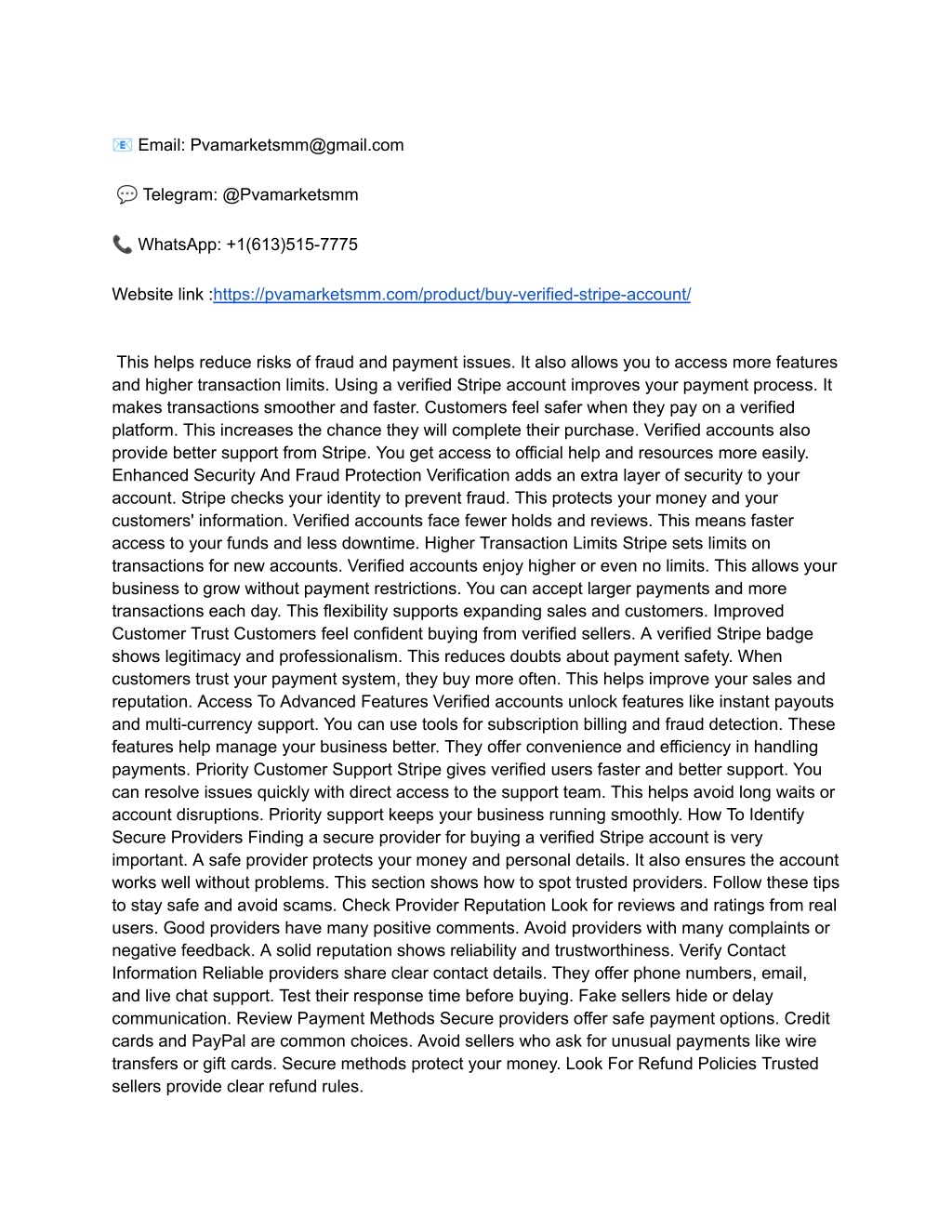 experience. Support teams assist with setup, verification, and troubleshooting. Common Risks And How To Avoid Them Buying a verified Stripe account carries certain risks. Understanding these risks helps protect your business and money. Taking smart steps lowers chances of problems. Here are some common risks and ways to avoid them. Risks Of Fraudulent Accounts Some accounts may be fake or stolen. Using such accounts can cause Stripe to block your payments. It can also lead to legal troubles. Always check the seller’s reputation. Verify the account details before buying. If You Wish To Confirm Your Order, Contact Us: ? Email: Pvamarketsmm@gmail.com ? Telegram: @Pvamarketsmm ? WhatsApp: +1(613)515-7775 Website link :https://pvamarketsmm.com/product/buy-verified-stripe-account/ Account Suspension And Closure Stripe often suspends accounts that violate its rules. Suspended accounts stop all transactions immediately. To avoid this, follow Stripe’s terms carefully. Choose accounts made for your business type. Financial Loss From Scams Scammers may sell accounts that do not work. You may lose money without getting a usable account. Pay only through secure methods. Ask for proof of account activity before paying. Security Risks Shared or poorly secured accounts risk hacking. This can expose your customer data. Use accounts with strong security settings. Change passwords and enable two-factor authentication. How To Find Safe Sellers Look for sellers with good reviews and clear contact info. Avoid deals that seem too cheap or too fast. Ask questions about account age, verification, and history. A trustworthy seller provides clear answers. Best Practices For Account Management Managing a verified Stripe account correctly is key to smooth business operations. Proper account management helps avoid payment issues and keeps your business running without interruptions. Following best practices ensures your account stays secure and compliant with Stripe’s rules. Simple steps can protect your account from being flagged or suspended. Clear organization and regular updates make handling payments easier. Let’s explore the best ways to manage your verified Stripe account effectively. Keep Your Account Information Updated Always update your business details promptly. This includes address, phone number, and tax information. Keeping your info current prevents verification problems. Stripe checks these details regularly to confirm your identity. Monitor Transactions Regularly Check your transactions every day. Look for unusual activities or errors. Early detection helps solve problems quickly. It also prevents fraud and chargebacks that can harm your account. Use Strong Security Measures Enable two-factor authentication for your Stripe account. Use strong passwords and change them regularly. Limit access to trusted team members only. These steps protect your account from hackers and unauthorized use. Follow Stripe’s Terms Of Service Read and understand Stripe’s rules before using the account. Avoid selling prohibited items or