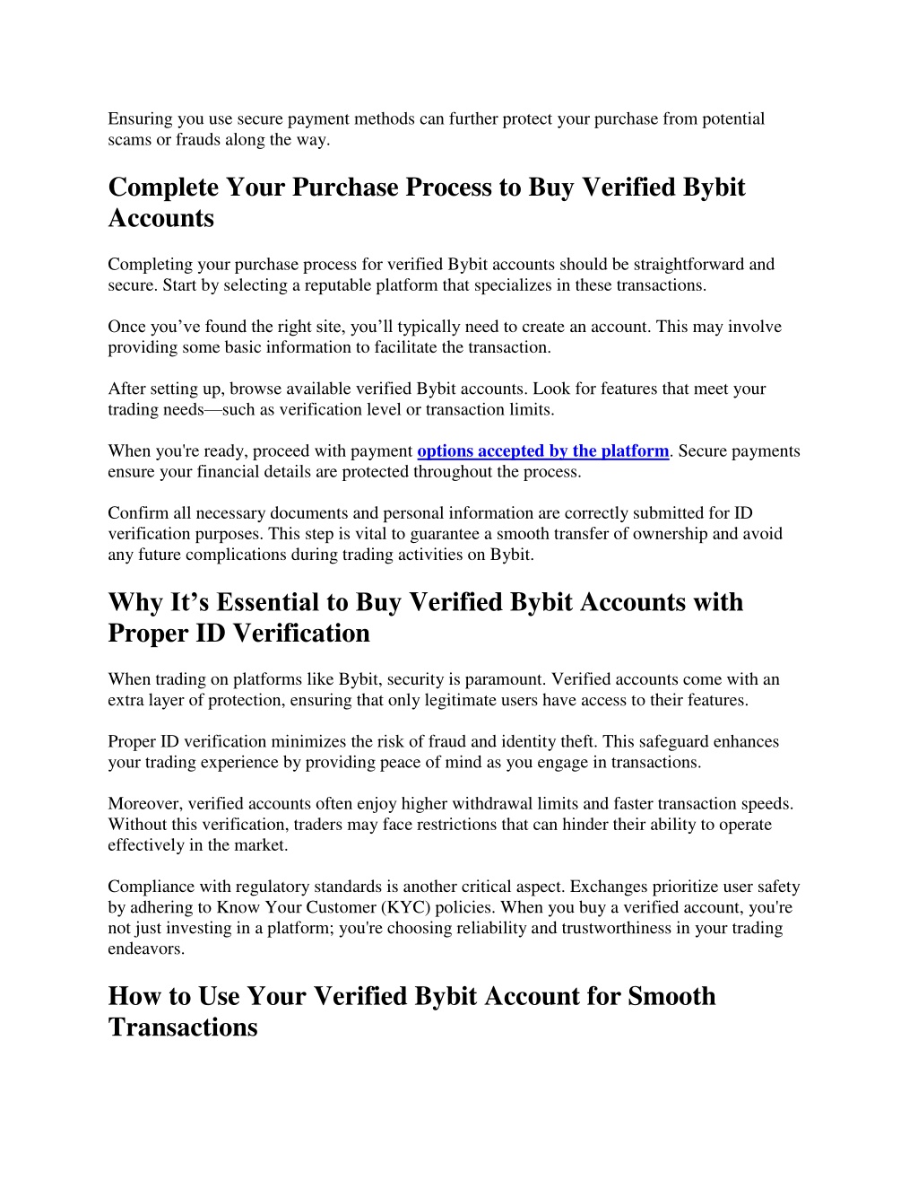 Ensuring you use secure payment methods can further protect your purchase from potential scams or frauds along the way. Complete Your Purchase Process to Buy Verified Bybit Accounts Completing your purchase process for verified Bybit accounts should be straightforward and secure. Start by selecting a reputable platform that specializes in these transactions. Once you’ve found the right site, you’ll typically need to create an account. This may involve providing some basic information to facilitate the transaction. After setting up, browse available verified Bybit accounts. Look for features that meet your trading needs—such as verification level or transaction limits. When you're ready, proceed with payment options accepted by the platform. Secure payments ensure your financial details are protected throughout the process. Confirm all necessary documents and personal information are correctly submitted for ID verification purposes. This step is vital to guarantee a smooth transfer of ownership and avoid any future complications during trading activities on Bybit. Why It’s Essential to Buy Verified Bybit Accounts with Proper ID Verification When trading on platforms like Bybit, security is paramount. Verified accounts come with an extra layer of protection, ensuring that only legitimate users have access to their features. Proper ID verification minimizes the risk of fraud and identity theft. This safeguard enhances your trading experience by providing peace of mind as you engage in transactions. Moreover, verified accounts often enjoy higher withdrawal limits and faster transaction speeds. Without this verification, traders may face restrictions that can hinder their ability to operate effectively in the market. Compliance with regulatory standards is another critical aspect. Exchanges prioritize user safety by adhering to Know Your Customer (KYC) policies. When you buy a verified account, you're not just investing in a platform; you're choosing reliability and trustworthiness in your trading endeavors. How to Use Your Verified Bybit Account for Smooth Transactions