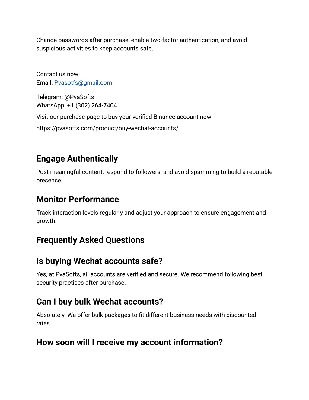 3. Change passwords after purchase, enable two-factor authentication, and avoid suspicious activities to keep accounts safe. Contact us now: Email: Pvasotfs@gmail.com Telegram: @PvaSofts WhatsApp: +1 (302) 264-7404 Visit our purchase page to buy your verified Binance account now: https://pvasofts.com/product/buy-wechat-accounts/ Engage Authentically Post meaningful content, respond to followers, and avoid spamming to build a reputable presence. Monitor Performance Track interaction levels regularly and adjust your approach to ensure engagement and growth. Frequently Asked Questions Is buying Wechat accounts safe? Yes, at PvaSofts, all accounts are verified and secure. We recommend following best security practices after purchase. Can I buy bulk Wechat accounts? Absolutely. We offer bulk packages to fit different business needs with discounted rates. How soon will I receive my account information?