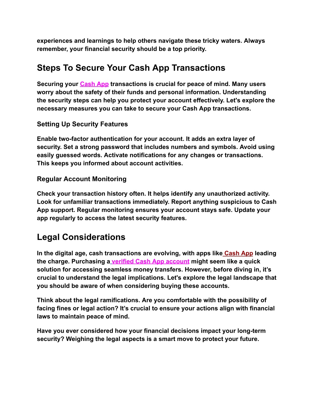 experiences and learnings to help others navigate these tricky waters. Always remember, your financial security should be a top priority. Steps To Secure Your Cash App Transactions Securing your Cash App transactions is crucial for peace of mind. Many users worry about the safety of their funds and personal information. Understanding the security steps can help you protect your account effectively. Let's explore the necessary measures you can take to secure your Cash App transactions. Setting Up Security Features Enable two-factor authentication for your account. It adds an extra layer of security. Set a strong password that includes numbers and symbols. Avoid using easily guessed words. Activate notifications for any changes or transactions. This keeps you informed about account activities. Regular Account Monitoring Check your transaction history often. It helps identify any unauthorized activity. Look for unfamiliar transactions immediately. Report anything suspicious to Cash App support. Regular monitoring ensures your account stays safe. Update your app regularly to access the latest security features. Legal Considerations In the digital age, cash transactions are evolving, with apps like Cash App leading the charge. Purchasing averified Cash App account might seem like a quick solution for accessing seamless money transfers. However, before diving in, it’s crucial to understand the legal implications. Let's explore the legal landscape that you should be aware of when considering buying these accounts. Think about the legal ramifications. Are you comfortable with the possibility of facing fines or legal action? It’s crucial to ensure your actions align with financial laws to maintain peace of mind. Have you ever considered how your financial decisions impact your long-term security? Weighing the legal aspects is a smart move to protect your future.