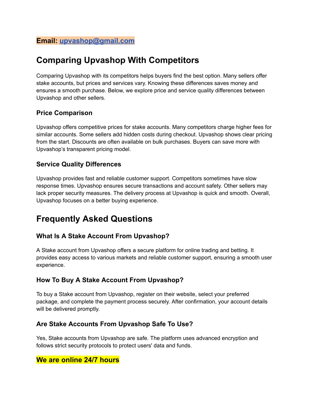 6. Email: upvashop@gmail.com Comparing Upvashop With Competitors Comparing Upvashop with its competitors helps buyers find the best option. Many sellers offer stake accounts, but prices and services vary. Knowing these differences saves money and ensures a smooth purchase. Below, we explore price and service quality differences between Upvashop and other sellers. Price Comparison Upvashop offers competitive prices for stake accounts. Many competitors charge higher fees for similar accounts. Some sellers add hidden costs during checkout. Upvashop shows clear pricing from the start. Discounts are often available on bulk purchases. Buyers can save more with Upvashop’s transparent pricing model. Service Quality Differences Upvashop provides fast and reliable customer support. Competitors sometimes have slow response times. Upvashop ensures secure transactions and account safety. Other sellers may lack proper security measures. The delivery process at Upvashop is quick and smooth. Overall, Upvashop focuses on a better buying experience. Frequently Asked Questions What Is A Stake Account From Upvashop? A Stake account from Upvashop offers a secure platform for online trading and betting. It provides easy access to various markets and reliable customer support, ensuring a smooth user experience. How To Buy A Stake Account From Upvashop? To buy a Stake account from Upvashop, register on their website, select your preferred package, and complete the payment process securely. After confirmation, your account details will be delivered promptly. Are Stake Accounts From Upvashop Safe To Use? Yes, Stake accounts from Upvashop are safe. The platform uses advanced encryption and follows strict security protocols to protect users' data and funds. We are online 24/7 hours