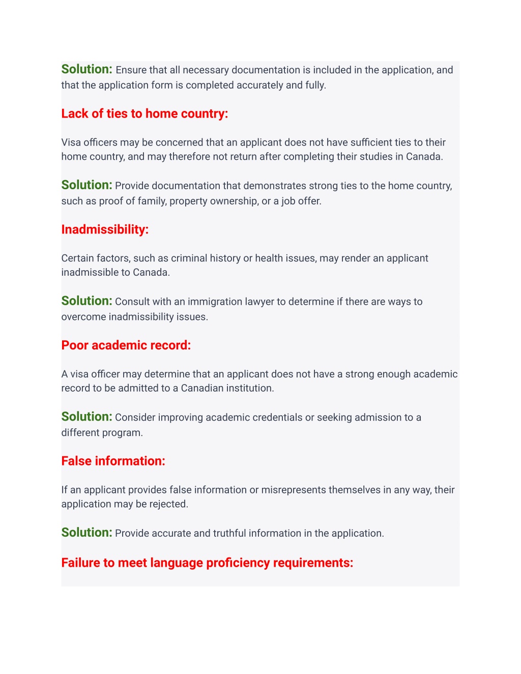 Solution: Ensure that all necessary documentation is included in the application, and that the application form is completed accurately and fully. Lack of ties to home country: Visa officers may be concerned that an applicant does not have sufficient ties to their home country, and may therefore not return after completing their studies in Canada. Solution: Provide documentation that demonstrates strong ties to the home country, such as proof of family, property ownership, or a job offer. Inadmissibility: Certain factors, such as criminal history or health issues, may render an applicant inadmissible to Canada. Solution: Consult with an immigration lawyer to determine if there are ways to overcome inadmissibility issues. Poor academic record: A visa officer may determine that an applicant does not have a strong enough academic record to be admitted to a Canadian institution. Solution: Consider improving academic credentials or seeking admission to a different program. False information: If an applicant provides false information or misrepresents themselves in any way, their application may be rejected. Solution: Provide accurate and truthful information in the application. Failure to meet language proficiency requirements: