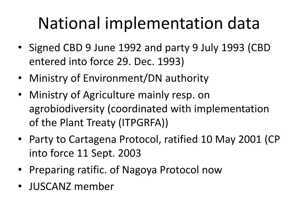 National implementation data • Signed CBD 9 June 1992 and party 9 July 1993 (CBD entered into force 29. Dec. 1993) • Ministry of Environment/DN authority • Ministry of Agriculture mainly resp. on agrobiodiversity (coordinated with implementation of the Plant Treaty (ITPGRFA)) • Party to Cartagena Protocol, ratified 10 May 2001 (CP into force 11 Sept. 2003 • Preparing ratific. of Nagoya Protocol now • JUSCANZ member