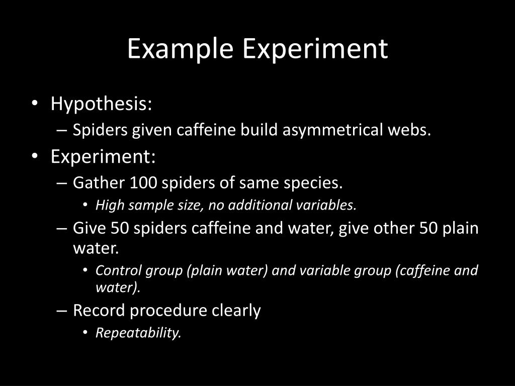 Example Experiment • Hypothesis: • Spiders given caffeine build asymmetrical webs. • Experiment: • Gather 100 spiders of same species. • High sample size, no additional variables. • Give 50 spiders caffeine and water, give other 50 plain water. • Control group (plain water) and variable group (caffeine and water). • Record procedure clearly • Repeatability.