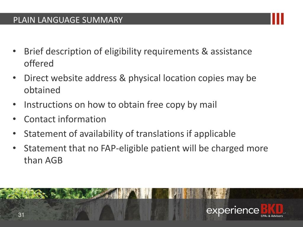 Plain Language Summary • Brief description of eligibility requirements & assistance offered • Direct website address & physical location copies may be obtained • Instructions on how to obtain free copy by mail • Contact information • Statement of availability of translations if applicable • Statement that no FAP-eligible patient will be charged more than AGB