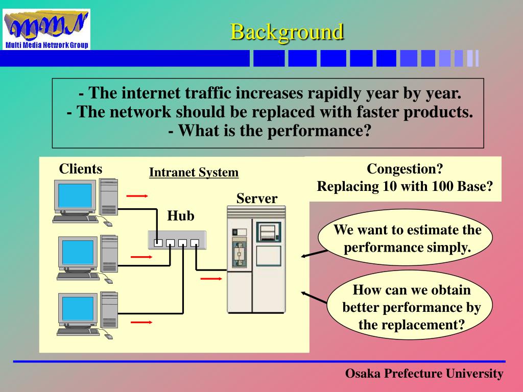 Background - The internet traffic increases rapidly year by year. - The network should be replaced with faster products. - What is the performance? Clients Congestion? Replacing 10 with 100 Base? Intranet System Server Hub We want to estimate the performance simply. How can we obtain better performance by the replacement?