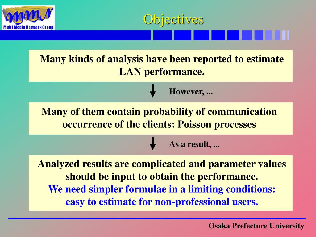 Objectives Many kinds of analysis have been reported to estimate LAN performance. However, ... Many of them contain probability of communication occurrence of the clients: Poisson processes As a result, ... Analyzed results are complicated and parameter values should be input to obtain the performance. We need simpler formulae in a limiting conditions: easy to estimate for non-professional users.