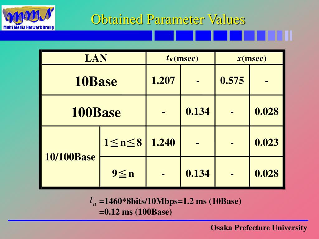 Obtained Parameter Values LAN t (msec) x (msec) u 10Base 1.207 - 0.575 - 100Base - 0.134 - 0.028 1 n 8 1.240 - - 0.023 ≦ ≦ 10/100Base 9 n - 0.134 - 0.028 ≦ =1460*8bits/10Mbps=1.2 ms (10Base) =0.12 ms (100Base)