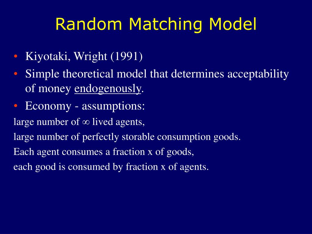 Random Matching Model • Kiyotaki, Wright (1991) • Simple theoretical model that determines acceptability of money endogenously. • Economy - assumptions: large number of lived agents, large number of perfectly storable consumption goods. Each agent consumes a fraction x of goods, each good is consumed by fraction x of agents.