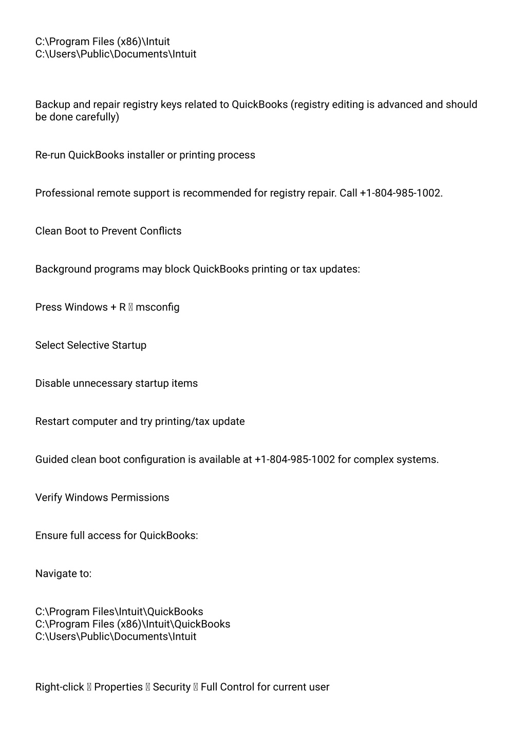 11. C:\Program Files (x86)\Intuit C:\Users\Public\Documents\Intuit Backup and repair registry keys related to QuickBooks (registry editing is advanced and should be done carefully) Re-run QuickBooks installer or printing process Professional remote support is recommended for registry repair. Call +1-804-985-1002. Clean Boot to Prevent Conflicts Background programs may block QuickBooks printing or tax updates: Press Windows + R ? msconfig Select Selective Startup Disable unnecessary startup items Restart computer and try printing/tax update Guided clean boot configuration is available at +1-804-985-1002 for complex systems. Verify Windows Permissions Ensure full access for QuickBooks: Navigate to: C:\Program Files\Intuit\QuickBooks C:\Program Files (x86)\Intuit\QuickBooks C:\Users\Public\Documents\Intuit Right-click ? Properties ? Security ? Full Control for current user