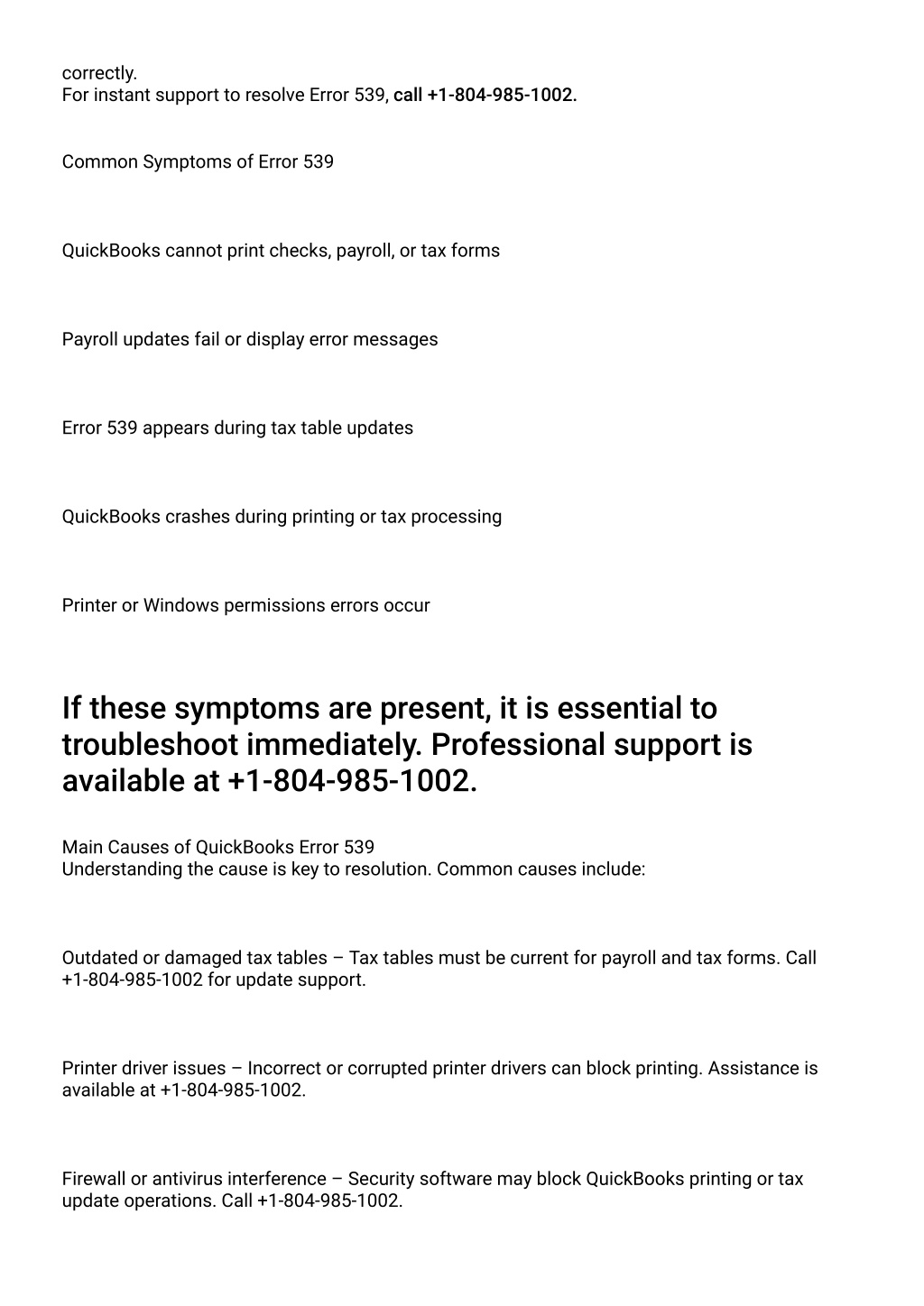 1. How to Fix +1-804-985-1002 QuickBooks Tax and Printing Error 539  QuickBooks Tax and Printing Error 539 is a common problem that occurs when users attempt to print tax forms, checks, or reports, or when tax updates fail. This error can disrupt payroll, filing, and business accounting operations, making timely resolution crucial. The error often occurs due to: +1-804-985-1002 Damaged or outdated QuickBooks installation Corrupted printer drivers Missing or outdated tax tables Firewall or antivirus blocking printing operations Windows permissions issues For immediate assistance, certified QuickBooks support is available at +1-804-985-1002. This guide provides a detailed step-by-step approach to fix Error 539, including basic troubleshooting, advanced repair methods, network/printer considerations, and preventive measures. Following these steps carefully will restore QuickBooks printing and tax functions without risking your company data. What Is QuickBooks Error 539? QuickBooks Error 539 typically occurs when the program fails to access necessary files for printing or tax updates. The error message often appears as: "QuickBooks Error 539: Printing or tax update failed. Verify your printer setup and tax table files." This indicates a conflict or corruption either in the printer setup, the QuickBooks installation, or the tax tables. Ignoring this error can prevent payroll forms and other reports from printing