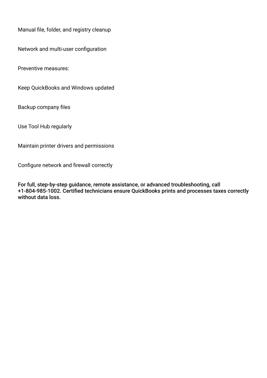 15. Manual file, folder, and registry cleanup Network and multi-user configuration Preventive measures: Keep QuickBooks and Windows updated Backup company files Use Tool Hub regularly Maintain printer drivers and permissions Configure network and firewall correctly For full, step-by-step guidance, remote assistance, or advanced troubleshooting, call +1-804-985-1002. Certified technicians ensure QuickBooks prints and processes taxes correctly without data loss.
