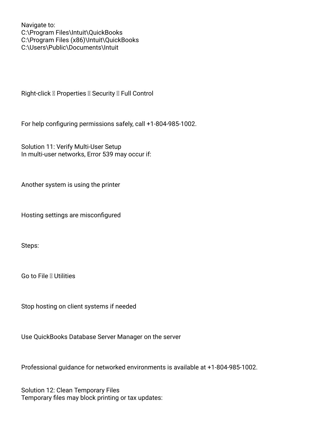 7. Navigate to: C:\Program Files\Intuit\QuickBooks C:\Program Files (x86)\Intuit\QuickBooks C:\Users\Public\Documents\Intuit   Right-click ? Properties ? Security ? Full Control For help configuring permissions safely, call +1-804-985-1002. Solution 11: Verify Multi-User Setup In multi-user networks, Error 539 may occur if: Another system is using the printer Hosting settings are misconfigured Steps: Go to File ? Utilities Stop hosting on client systems if needed Use QuickBooks Database Server Manager on the server Professional guidance for networked environments is available at +1-804-985-1002. Solution 12: Clean Temporary Files Temporary files may block printing or tax updates: