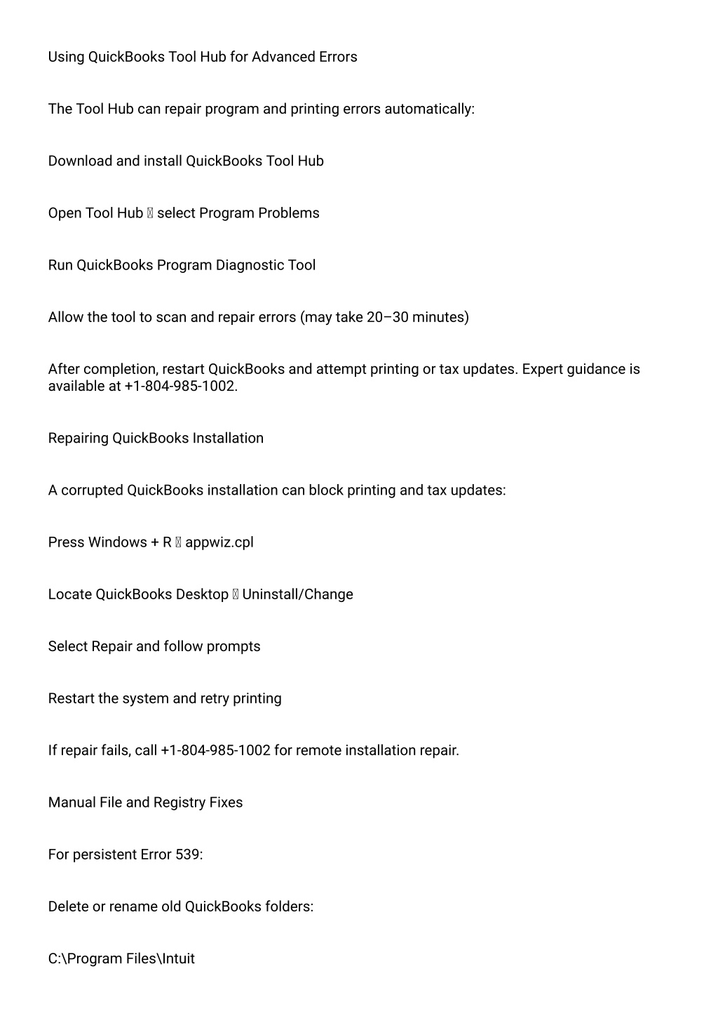 10. Using QuickBooks Tool Hub for Advanced Errors The Tool Hub can repair program and printing errors automatically: Download and install QuickBooks Tool Hub Open Tool Hub ? select Program Problems Run QuickBooks Program Diagnostic Tool Allow the tool to scan and repair errors (may take 20–30 minutes) After completion, restart QuickBooks and attempt printing or tax updates. Expert guidance is available at +1-804-985-1002. Repairing QuickBooks Installation A corrupted QuickBooks installation can block printing and tax updates: Press Windows + R ? appwiz.cpl Locate QuickBooks Desktop ? Uninstall/Change Select Repair and follow prompts Restart the system and retry printing If repair fails, call +1-804-985-1002 for remote installation repair. Manual File and Registry Fixes For persistent Error 539: Delete or rename old QuickBooks folders: C:\Program Files\Intuit