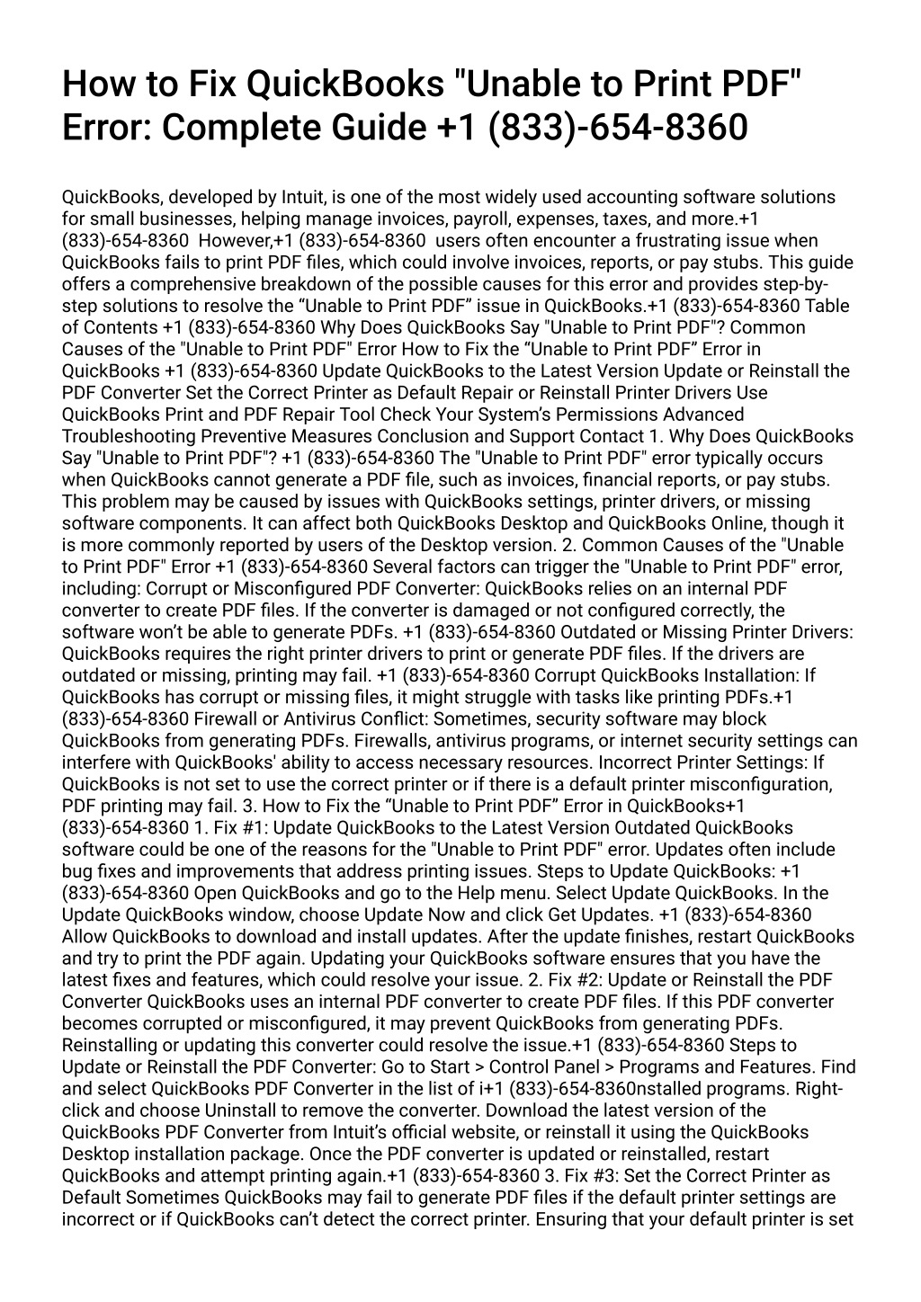 1. How to Fix QuickBooks "Unable to Print PDF" Error: Complete Guide +1 (833)-654-8360 QuickBooks, developed by Intuit, is one of the most widely used accounting software solutions for small businesses, helping manage invoices, payroll, expenses, taxes, and more.+1 (833)-654-8360  However,+1 (833)-654-8360  users often encounter a frustrating issue when QuickBooks fails to print PDF files, which could involve invoices, reports, or pay stubs. This guide offers a comprehensive breakdown of the possible causes for this error and provides step-by- step solutions to resolve the “Unable to Print PDF” issue in QuickBooks.+1 (833)-654-8360 Table of Contents +1 (833)-654-8360 Why Does QuickBooks Say "Unable to Print PDF"? Common Causes of the "Unable to Print PDF" Error How to Fix the “Unable to Print PDF” Error in QuickBooks +1 (833)-654-8360 Update QuickBooks to the Latest Version Update or Reinstall the PDF Converter Set the Correct Printer as Default Repair or Reinstall Printer Drivers Use QuickBooks Print and PDF Repair Tool Check Your System’s Permissions Advanced Troubleshooting Preventive Measures Conclusion and Support Contact 1. Why Does QuickBooks Say "Unable to Print PDF"? +1 (833)-654-8360 The "Unable to Print PDF" error typically occurs when QuickBooks cannot generate a PDF file, such as invoices, financial reports, or pay stubs. This problem may be caused by issues with QuickBooks settings, printer drivers, or missing software components. It can affect both QuickBooks Desktop and QuickBooks Online, though it is more commonly reported by users of the Desktop version. 2. Common Causes of the "Unable to Print PDF" Error +1 (833)-654-8360 Several factors can trigger the "Unable to Print PDF" error, including: Corrupt or Misconfigured PDF Converter: QuickBooks relies on an internal PDF converter to create PDF files. If the converter is damaged or not configured correctly, the software won’t be able to generate PDFs. +1 (833)-654-8360 Outdated or Missing Printer Drivers: QuickBooks requires the right printer drivers to print or generate PDF files. If the drivers are outdated or missing, printing may fail. +1 (833)-654-8360 Corrupt QuickBooks Installation: If QuickBooks has corrupt or missing files, it might struggle with tasks like printing PDFs.+1 (833)-654-8360 Firewall or Antivirus Conflict: Sometimes, security software may block QuickBooks from generating PDFs. Firewalls, antivirus programs, or internet security settings can interfere with QuickBooks' ability to access necessary resources. Incorrect Printer Settings: If QuickBooks is not set to use the correct printer or if there is a default printer misconfiguration, PDF printing may fail. 3. How to Fix the “Unable to Print PDF” Error in QuickBooks+1 (833)-654-8360 1. Fix #1: Update QuickBooks to the Latest Version Outdated QuickBooks software could be one of the reasons for the "Unable to Print PDF" error. Updates often include bug fixes and improvements that address printing issues. Steps to Update QuickBooks: +1 (833)-654-8360 Open QuickBooks and go to the Help menu. Select Update QuickBooks. In the Update QuickBooks window, choose Update Now and click Get Updates. +1 (833)-654-8360 Allow QuickBooks to download and install updates. After the update finishes, restart QuickBooks and try to print the PDF again. Updating your QuickBooks software ensures that you have the latest fixes and features, which could resolve your issue. 2. Fix #2: Update or Reinstall the PDF Converter QuickBooks uses an internal PDF converter to create PDF files. If this PDF converter becomes corrupted or misconfigured, it may prevent QuickBooks from generating PDFs. Reinstalling or updating this converter could resolve the issue.+1 (833)-654-8360 Steps to Update or Reinstall the PDF Converter: Go to Start > Control Panel > Programs and Features. Find and select QuickBooks PDF Converter in the list of i+1 (833)-654-8360nstalled programs. Right- click and choose Uninstall to remove the converter. Download the latest version of the QuickBooks PDF Converter from Intuit’s official website, or reinstall it using the QuickBooks Desktop installation package. Once the PDF converter is updated or reinstalled, restart QuickBooks and attempt printing again.+1 (833)-654-8360 3. Fix #3: Set the Correct Printer as Default Sometimes QuickBooks may fail to generate PDF files if the default printer settings are incorrect or if QuickBooks can’t detect the correct printer. Ensuring that your default printer is set
