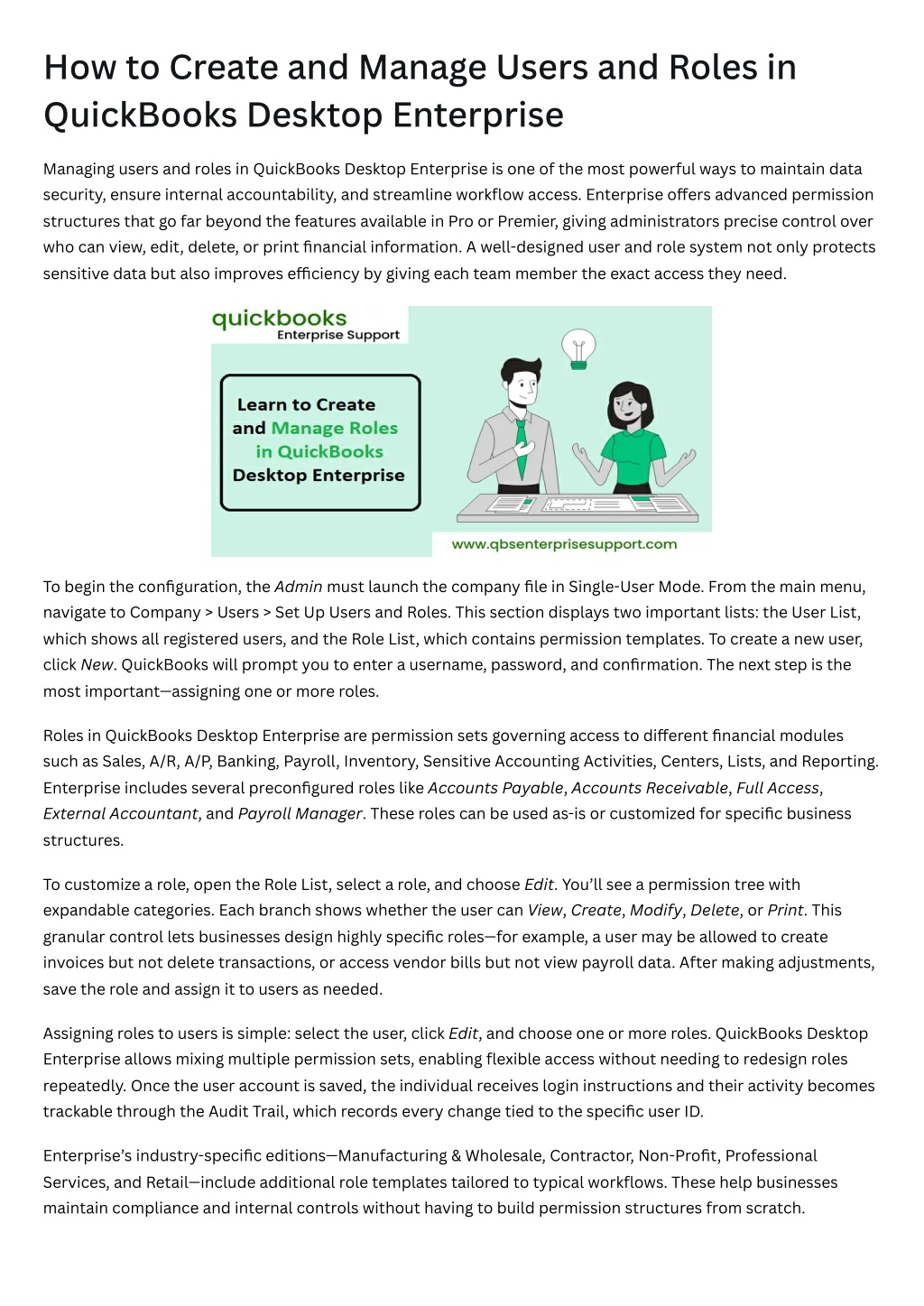 1. How to Create and Manage Users and Roles in QuickBooks Desktop Enterprise Managing users and roles in QuickBooks Desktop Enterprise is one of the most powerful ways to maintain data security, ensure internal accountability, and streamline workflow access. Enterprise offers advanced permission structures that go far beyond the features available in Pro or Premier, giving administrators precise control over who can view, edit, delete, or print financial information. A well-designed user and role system not only protects sensitive data but also improves efficiency by giving each team member the exact access they need. To begin the configuration, the Admin must launch the company file in Single-User Mode. From the main menu, navigate to Company > Users > Set Up Users and Roles. This section displays two important lists: the User List, which shows all registered users, and the Role List, which contains permission templates. To create a new user, click New. QuickBooks will prompt you to enter a username, password, and confirmation. The next step is the most important—assigning one or more roles. Roles in QuickBooks Desktop Enterprise are permission sets governing access to different financial modules such as Sales, A/R, A/P, Banking, Payroll, Inventory, Sensitive Accounting Activities, Centers, Lists, and Reporting. Enterprise includes several preconfigured roles like Accounts Payable, Accounts Receivable, Full Access, External Accountant, and Payroll Manager. These roles can be used as-is or customized for specific business structures. To customize a role, open the Role List, select a role, and choose Edit. You’ll see a permission tree with expandable categories. Each branch shows whether the user can View, Create, Modify, Delete, or Print. This granular control lets businesses design highly specific roles—for example, a user may be allowed to create invoices but not delete transactions, or access vendor bills but not view payroll data. After making adjustments, save the role and assign it to users as needed. Assigning roles to users is simple: select the user, click Edit, and choose one or more roles. QuickBooks Desktop Enterprise allows mixing multiple permission sets, enabling flexible access without needing to redesign roles repeatedly. Once the user account is saved, the individual receives login instructions and their activity becomes trackable through the Audit Trail, which records every change tied to the specific user ID. Enterprise’s industry-specific editions—Manufacturing & Wholesale, Contractor, Non-Profit, Professional Services, and Retail—include additional role templates tailored to typical workflows. These help businesses maintain compliance and internal controls without having to build permission structures from scratch.