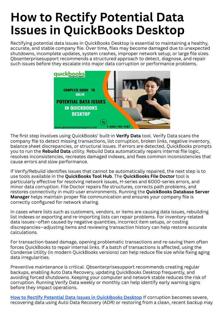1. How to Rectify Potential Data Issues in QuickBooks Desktop Rectifying potential data issues in QuickBooks Desktop is essential to maintaining a healthy, accurate, and stable company file. Over time, files may become damaged due to unexpected shutdowns, incomplete updates, system crashes, improper network setup, or large file sizes. Qbsenterprisesupport recommends a structured approach to detect, diagnose, and repair such issues before they escalate into major data corruption or performance problems. The first step involves using QuickBooks’ built-in Verify Data tool. Verify Data scans the company file to detect missing transactions, list corruption, broken links, negative inventory, balance sheet discrepancies, or structural issues. If errors are detected, QuickBooks prompts you to run the Rebuild Data utility. Rebuild Data automatically repairs internal file logic, resolves inconsistencies, recreates damaged indexes, and fixes common inconsistencies that cause errors and slow performance. If Verify/Rebuild identifies issues that cannot be automatically repaired, the next step is to use tools available in the QuickBooks Tool Hub. The QuickBooks File Doctor tool is particularly effective for resolving network issues, H-series and 6000-series errors, and minor data corruption. File Doctor repairs file structures, corrects path problems, and restores connectivity in multi-user environments. Running the QuickBooks Database Server Manager helps maintain proper file communication and ensures your company file is correctly configured for network sharing. In cases where lists such as customers, vendors, or items are causing data issues, rebuilding list indexes or exporting and re-importing lists can repair problems. For inventory-related data issues—often caused by negative quantities, incorrect item setups, or costing discrepancies—adjusting items and reviewing transaction history can help restore accurate calculations. For transaction-based damage, opening problematic transactions and re-saving them often forces QuickBooks to repair internal links. If a batch of transactions is affected, using the Condense Utility (in modern QuickBooks versions) can help reduce file size while fixing aging data irregularities. Preventive maintenance is critical. Qbsenterprisesupport recommends creating regular backups, enabling Auto Data Recovery, updating QuickBooks Desktop frequently, and avoiding forced shutdowns. Keeping your computer and network stable reduces the risk of corruption. Running Verify Data weekly or monthly can help identify early warning signs before they impact operations. How to Rectify Potential Data Issues in QuickBooks Desktop If corruption becomes severe, recovering data using Auto Data Recovery (ADR) or restoring from a clean, recent backup may