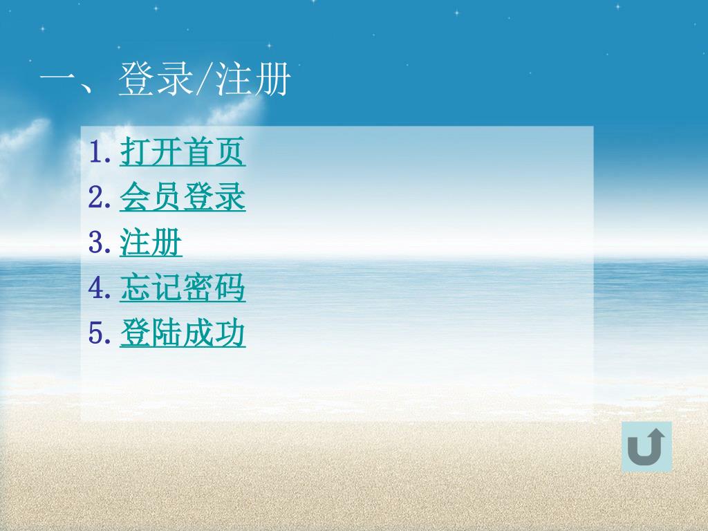 一、登录/注册 • 打开首页 • 会员登录 • 注册 • 忘记密码 • 登陆成功