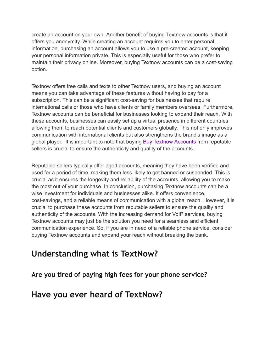 create an account on your own. Another benefit of buying Textnow accounts is that it offers you anonymity. While creating an account requires you to enter personal information, purchasing an account allows you to use a pre-created account, keeping your personal information private. This is especially useful for those who prefer to maintain their privacy online. Moreover, buying Textnow accounts can be a cost-saving option. Textnow offers free calls and texts to other Textnow users, and buying an account means you can take advantage of these features without having to pay for a subscription. This can be a significant cost-saving for businesses that require international calls or those who have clients or family members overseas. Furthermore, Textnow accounts can be beneficial for businesses looking to expand their reach. With these accounts, businesses can easily set up a virtual presence in different countries, allowing them to reach potential clients and customers globally. This not only improves communication with international clients but also strengthens the brand’s image as a global player. It is important to note that buying Buy Textnow Accounts from reputable sellers is crucial to ensure the authenticity and quality of the accounts. Reputable sellers typically offer aged accounts, meaning they have been verified and used for a period of time, making them less likely to get banned or suspended. This is crucial as it ensures the longevity and reliability of the accounts, allowing you to make the most out of your purchase. In conclusion, purchasing Textnow accounts can be a wise investment for individuals and businesses alike. It offers convenience, cost-savings, and a reliable means of communication with a global reach. However, it is crucial to purchase these accounts from reputable sellers to ensure the quality and authenticity of the accounts. With the increasing demand for VoIP services, buying Textnow accounts may just be the solution you need for a seamless and efficient communication experience. So, if you are in need of a reliable phone service, consider buying Textnow accounts and expand your reach without breaking the bank. Understanding what is TextNow? Are you tired of paying high fees for your phone service? Have you ever heard of TextNow?