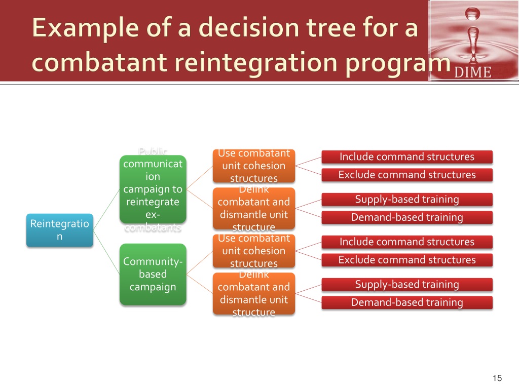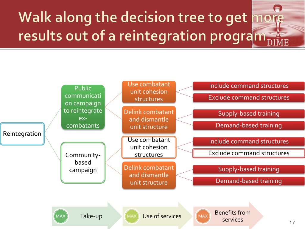 NEXT: Do we know ex ante… • On Community Driven Development, what • information will get communities to respond? • facilitation will results in high quality proposals? • rules will increase inclusion in the decision-making process? • monitoring mechanisms and co-payments will improve local projects and their use of funds? • On Disarmament, Demobilization and Reintegration, • are community based or targeted approaches most effective? • should we try to delink combatants from units or build on unit cohesion? • is including or excluding command structures most effective?