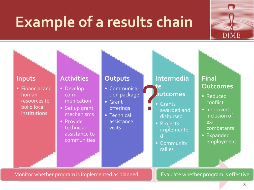 Arianna Legovini Head, Development Impact Evaluation Initiative (DIME) World Bank. Impact Evaluation for Real Time Decision Making. FIRST What is a results chain?. Example of a results chain. ?. The results chain. Developmental hypothesis that helps you define: