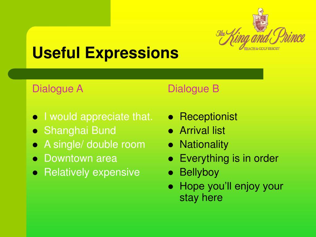 Dialogue A I would appreciate that. Shanghai Bund A single/ double room Downtown area Relatively expensive Dialogue B Receptionist Arrival list Nationality Everything is in order Bellyboy Hope you’ll enjoy your stay here Useful Expressions