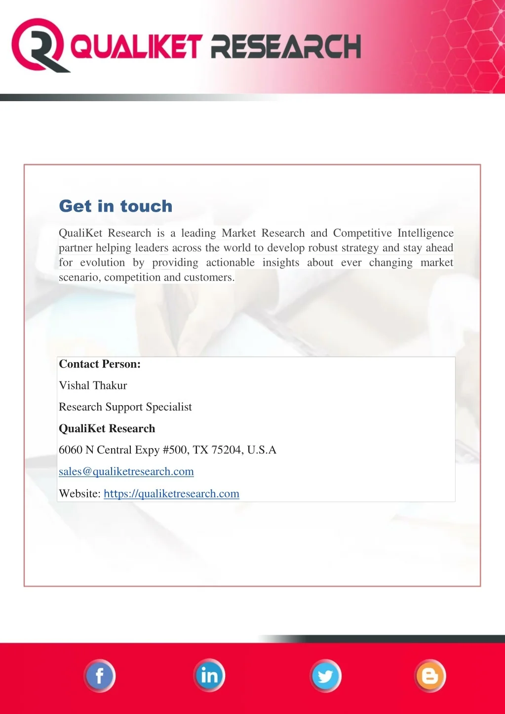 Get in touch QualiKet Research is a leading Market Research and Competitive Intelligence partner helping leaders across the world to develop robust strategy and stay ahead for evolution by providing actionable insights about ever changing market scenario, competition and customers. Contact Person: Vishal Thakur Research Support Specialist QualiKet Research 6060 N Central Expy #500, TX 75204, U.S.A sales@qualiketresearch.com Website: https://qualiketresearch.com
