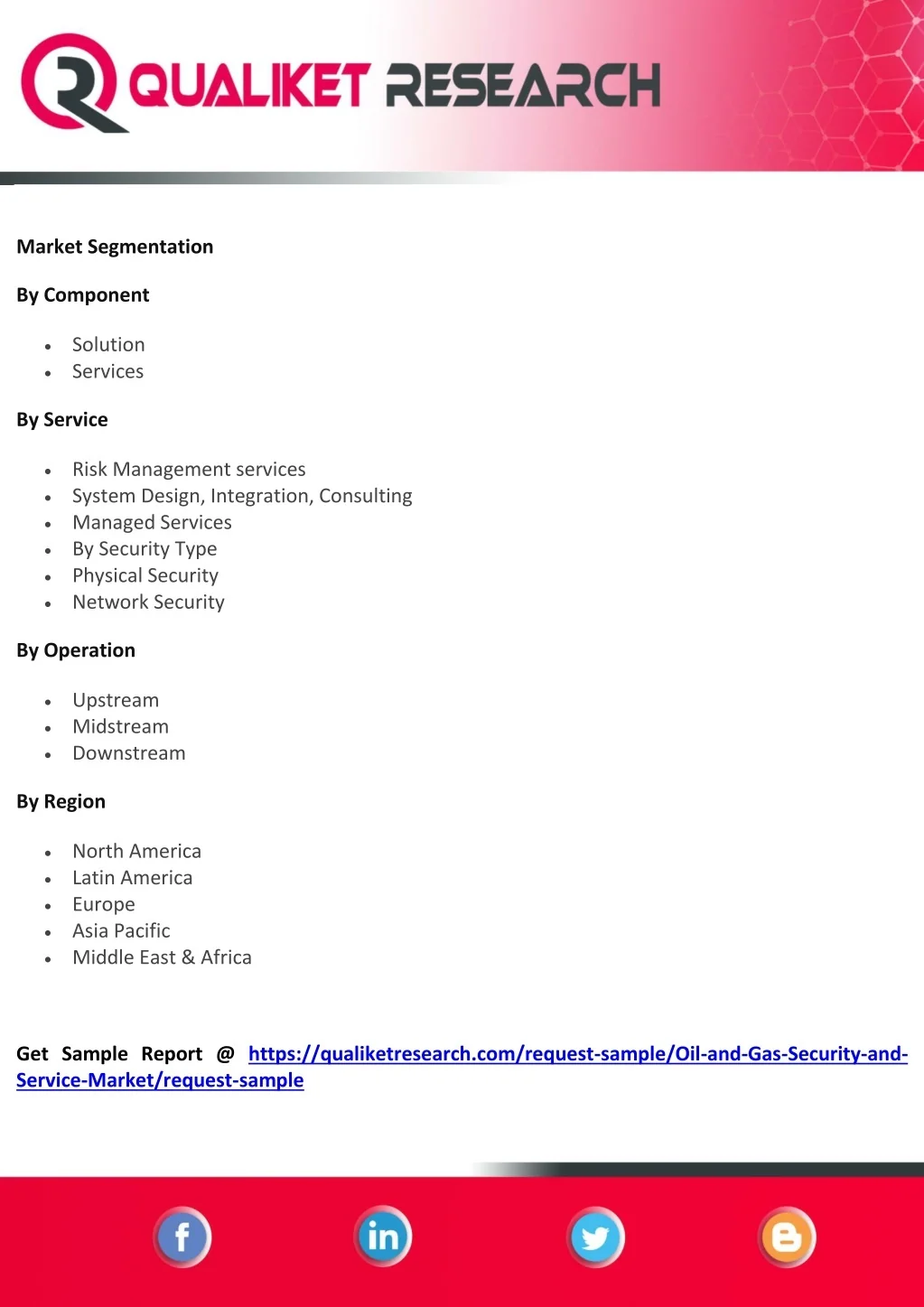Market Segmentation By Component Solution Services By Service Risk Management services System Design, Integration, Consulting Managed Services By Security Type Physical Security Network Security By Operation Upstream Midstream Downstream By Region North America Latin America Europe Asia Pacific Middle East & Africa Get Sample Report @ https://qualiketresearch.com/request-sample/Oil-and-Gas-Security-and- Service-Market/request-sample