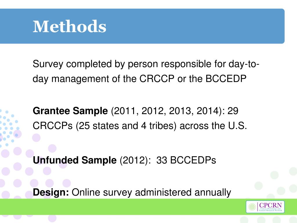 Methods Survey completed by person responsible for day-to-day management of the CRCCP or the BCCEDP Grantee Sample (2011, 2012, 2013, 2014): 29 CRCCPs (25 states and 4 tribes) across the U.S. Unfunded Sample (2012): 33 BCCEDPs Design: Online survey administered annually