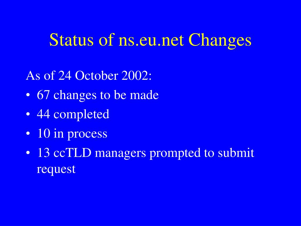 Status of ns.eu.net Changes As of 24 October 2002: • 67 changes to be made • 44 completed • 10 in process • 13 ccTLD managers prompted to submit request